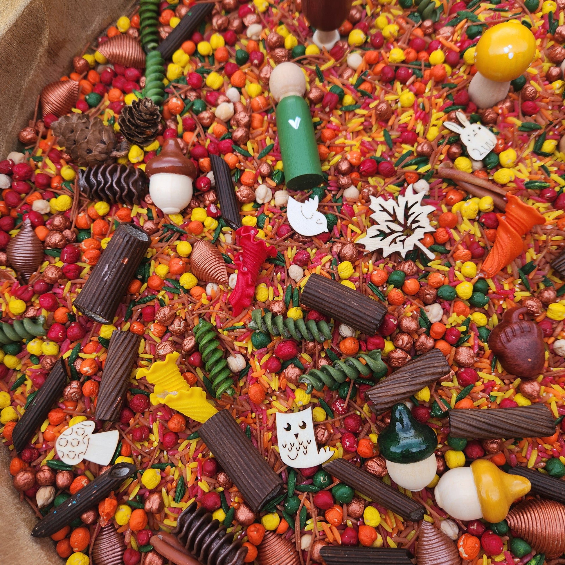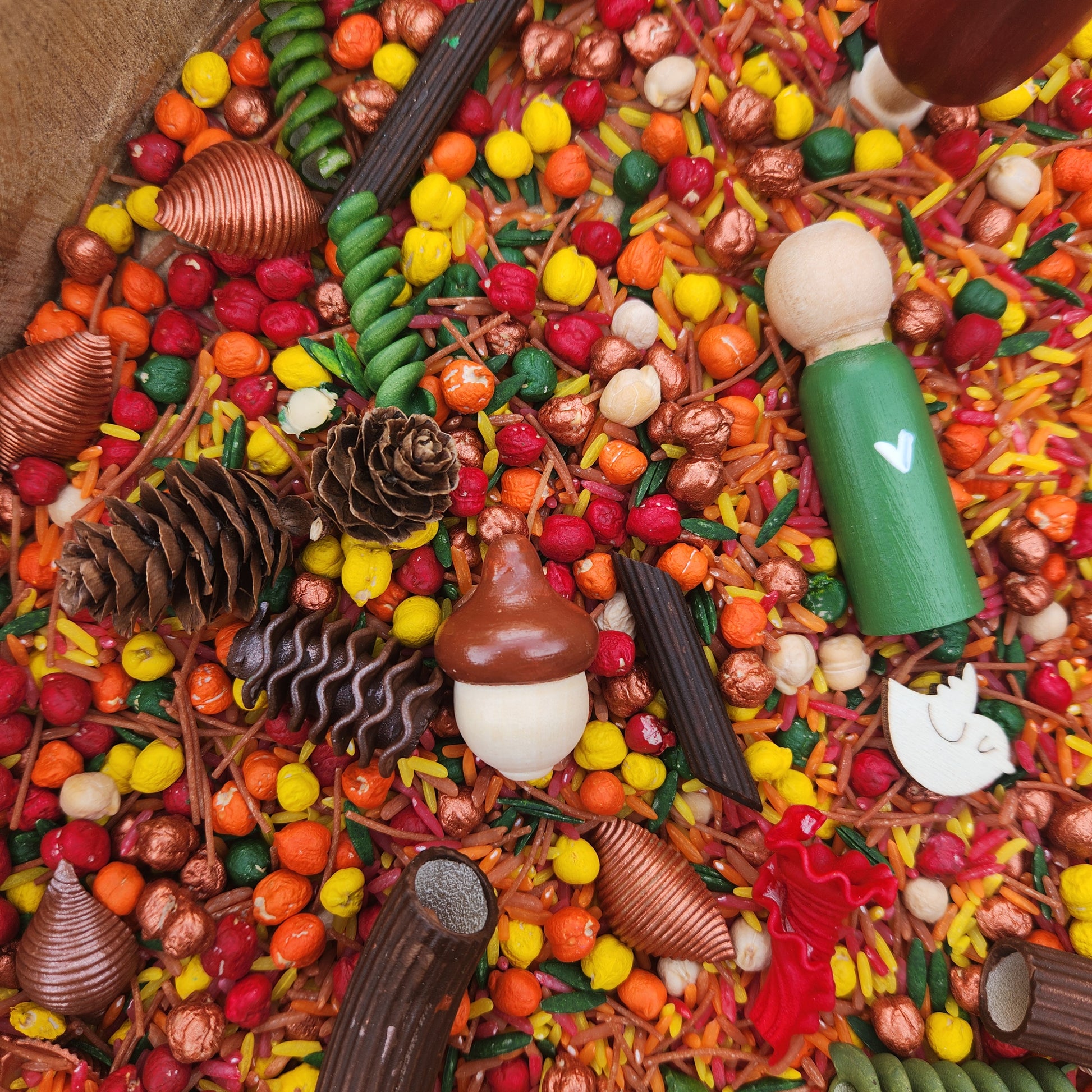 This seasonal pour and play set includes handmade resin elements and hand painted wooden autumn themed loose parts, carefully curated to create a textured, open-ended sensory invitation inspired by the colours of fall.
